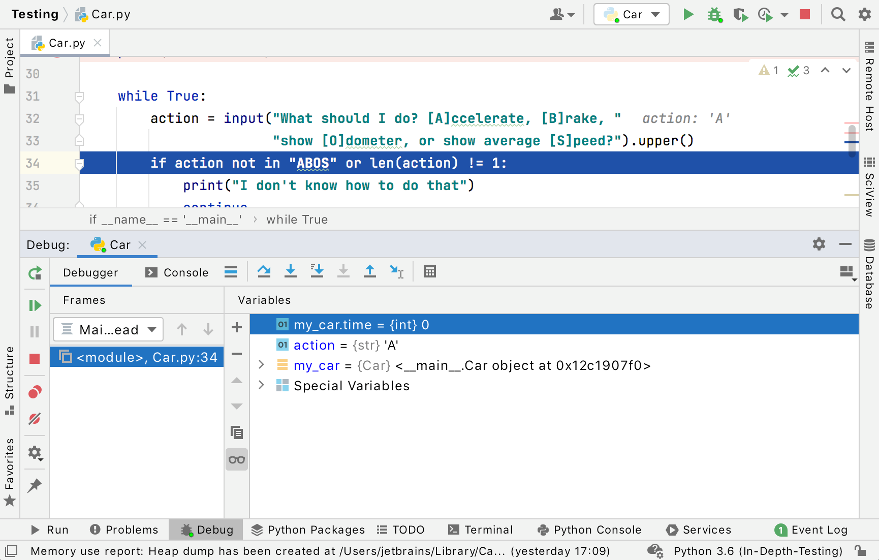 如果单击Step Into按钮走进图标,将看到action = input("What should I do? [A]ccelerate, [B]rake, " "show [O]dometer, or show average [S]peed?").upper()调试器进入文件parse.py的行之后: