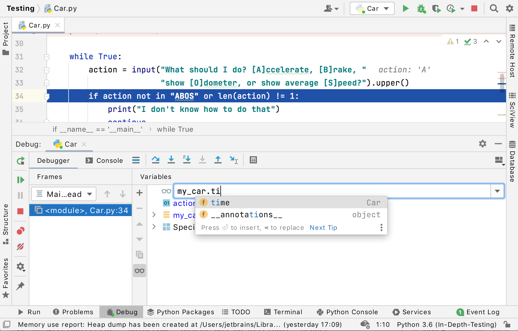 PyCharm 允许观察任何变量。只需在Evaluate and Watch字段中输入想观察的变量的名称:my_car.time。请注意,此处提供了代码完成功能。然后单击该字段旁边的添加按钮 。