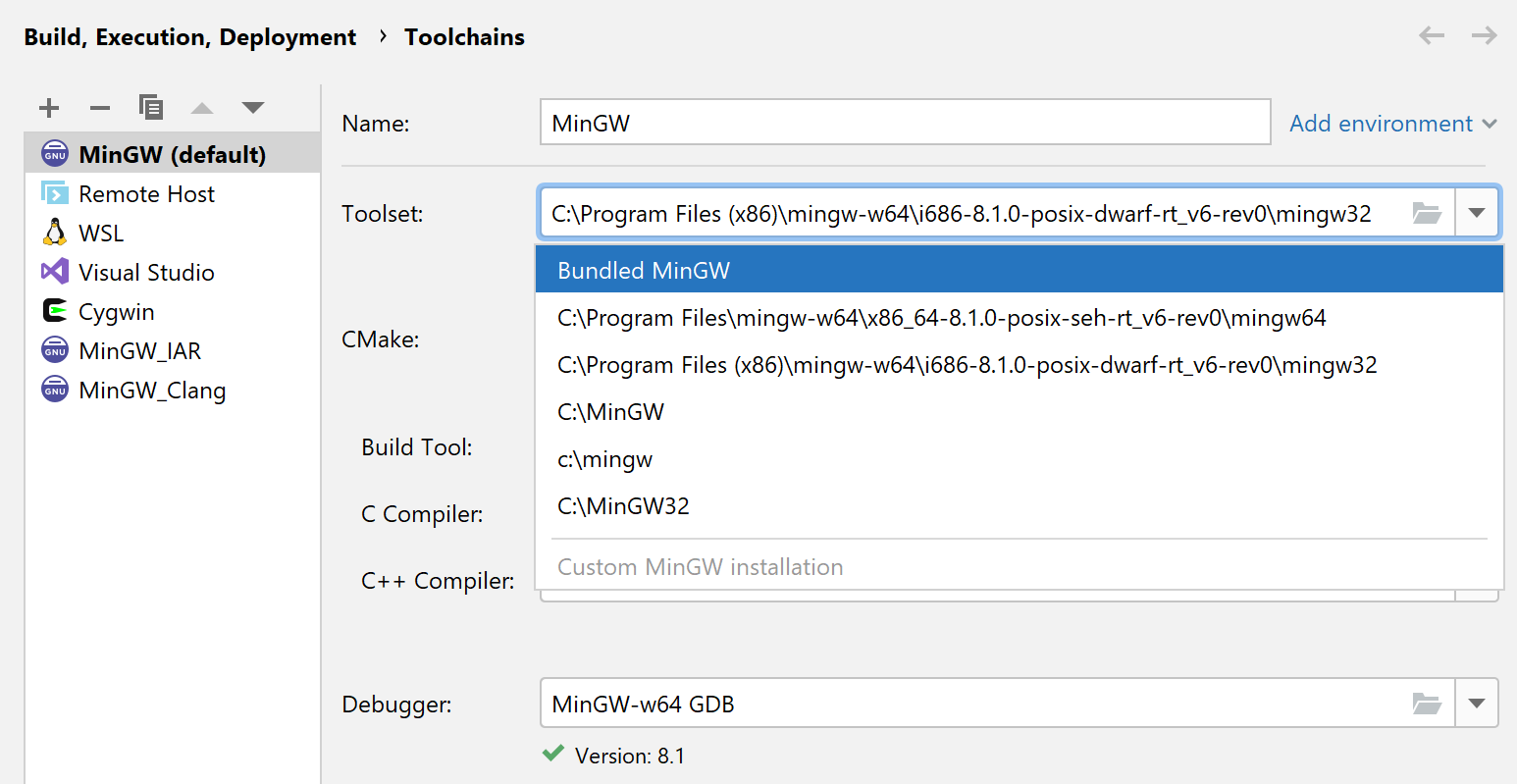 单击添加工具链并选择MinGW以添加新的 MinGW 工具链。在Toolset字段中,您将看到Bundled MinGW,这是默认选项。如果需要,请打开该字段以从其他可用安装列表中进行选择:
