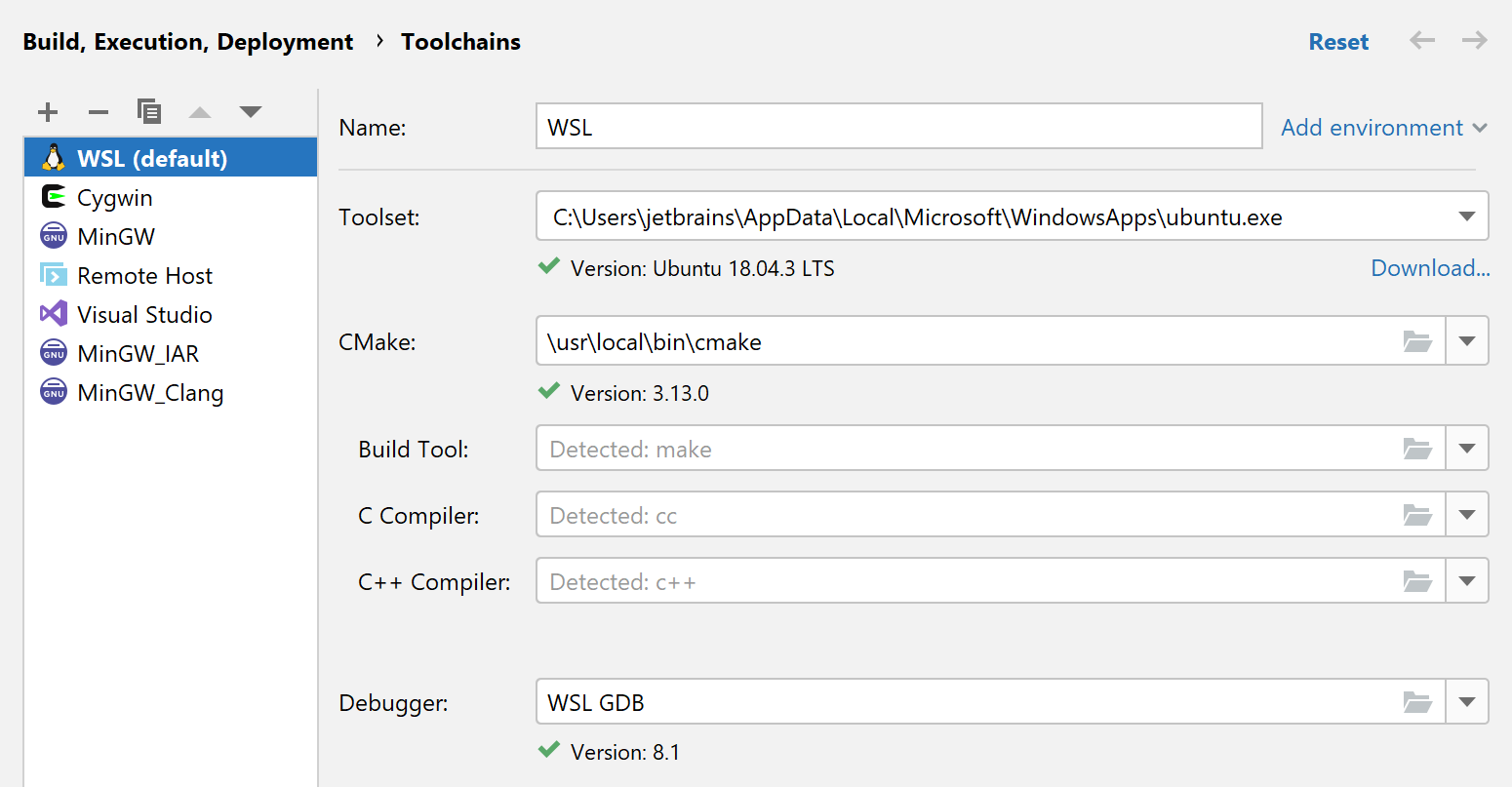 - 安装完成后,打开CLion并转到File | 设置 | 构建、执行、部署 | 工具链。