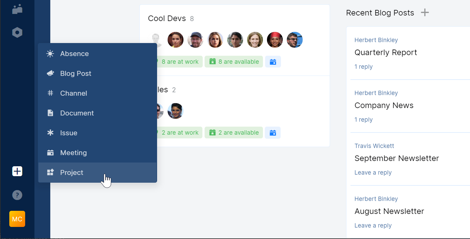 要创建一个新项目,只需单击加-add.png导航栏并选择Project。您可以将项目设为私有以限制对其的访问或使其对公司内的每个人都可见。(受限项目从组织计划开始可用。)