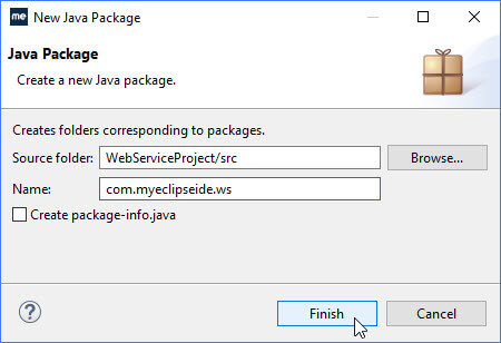 - 在 Name 字段中输入com.myeclipseide.ws,然后单击 Finish。