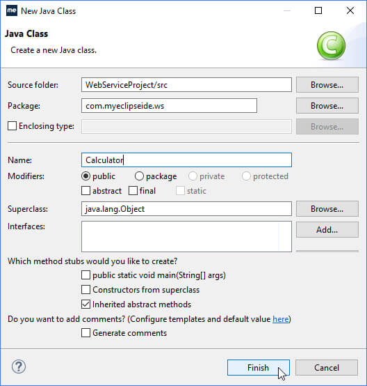 - 右键单击 com.myeclipseide.ws 包,然后选择 New>Class。
