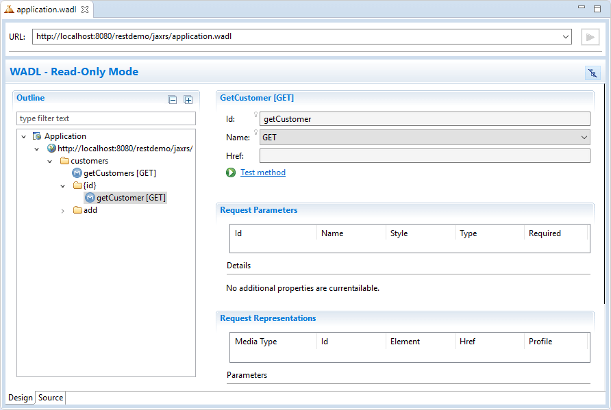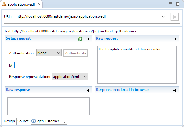 注意:如果您将 restdemo 部署到 MyEclipse Tomcat 以外的应用程序服务器,则资源管理器中使用的 WADL URL 可能包含不正确的端口,从而阻止资源管理器加载您的 WADL 文件。更正端口,然后单击执行按钮继续。
