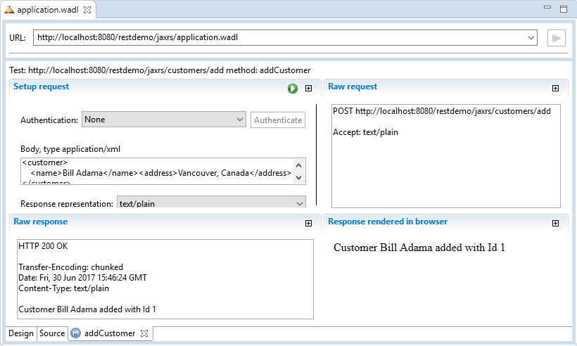 - 在 Body 中,键入 addCustomer 选项卡的 application/xml 区域,粘贴以下代码,然后单击。