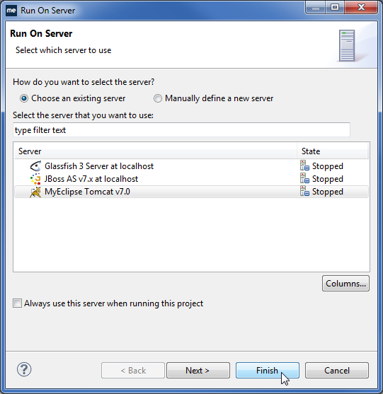 - 选择 MyEclipse Tomcat,然后单击 Finish。
