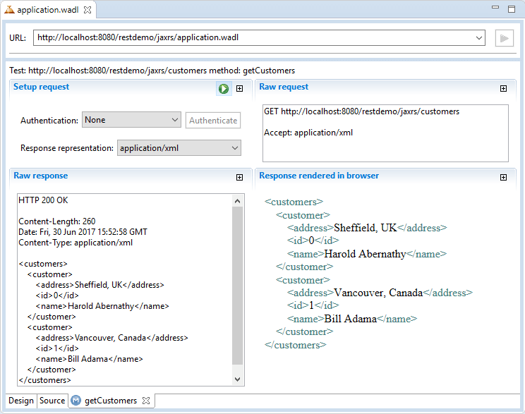 - 单击。服务以 XML 格式返回列表中的两个客户。