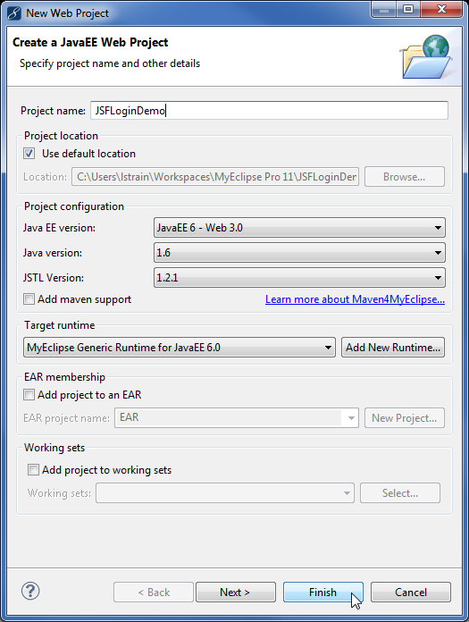 - 在Project name字段中输入JSFLoginDemo,然后单击 Finish。注意:本教程使用默认的 JavaEE 6 版本;但是,在创建新项目时,JavaEE 7 是一个可用的选项。创建 Web 项目