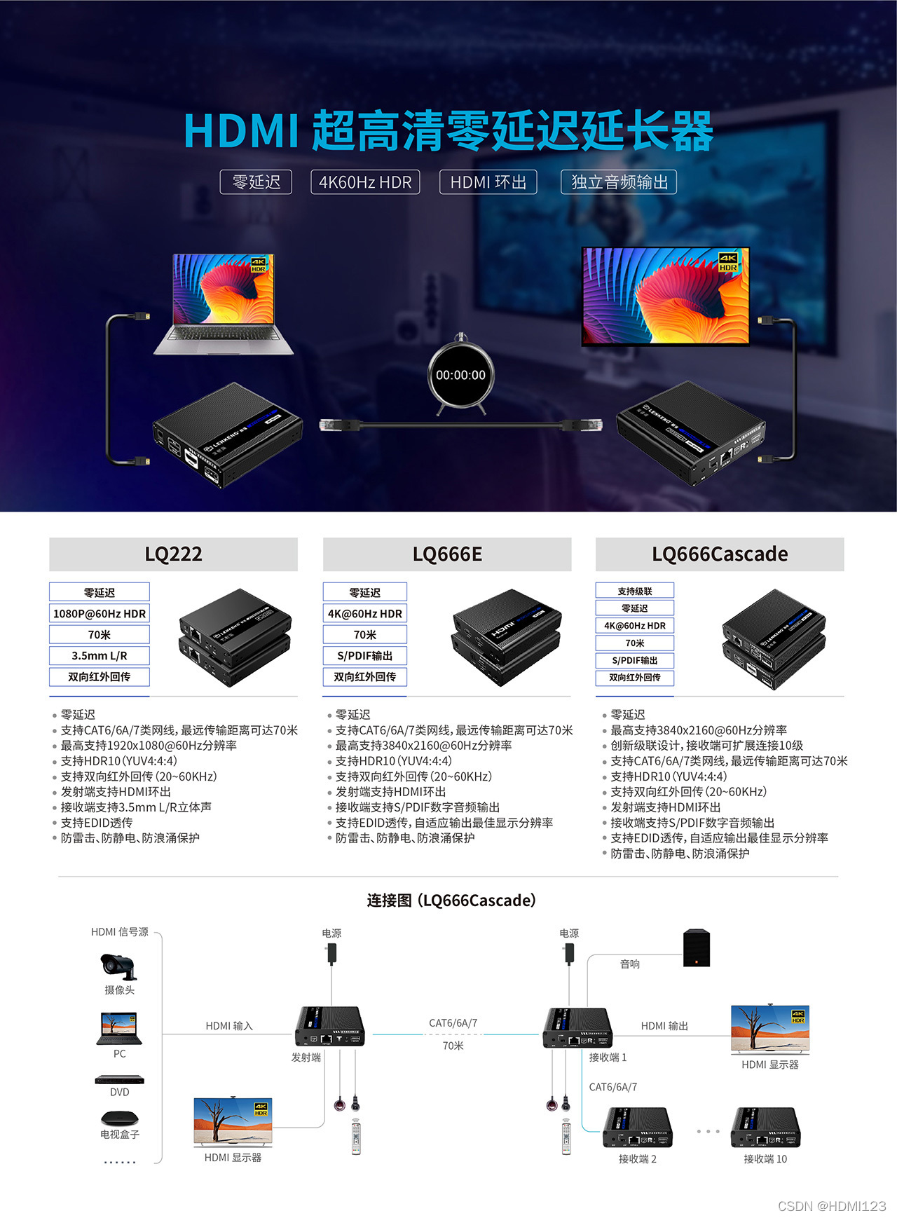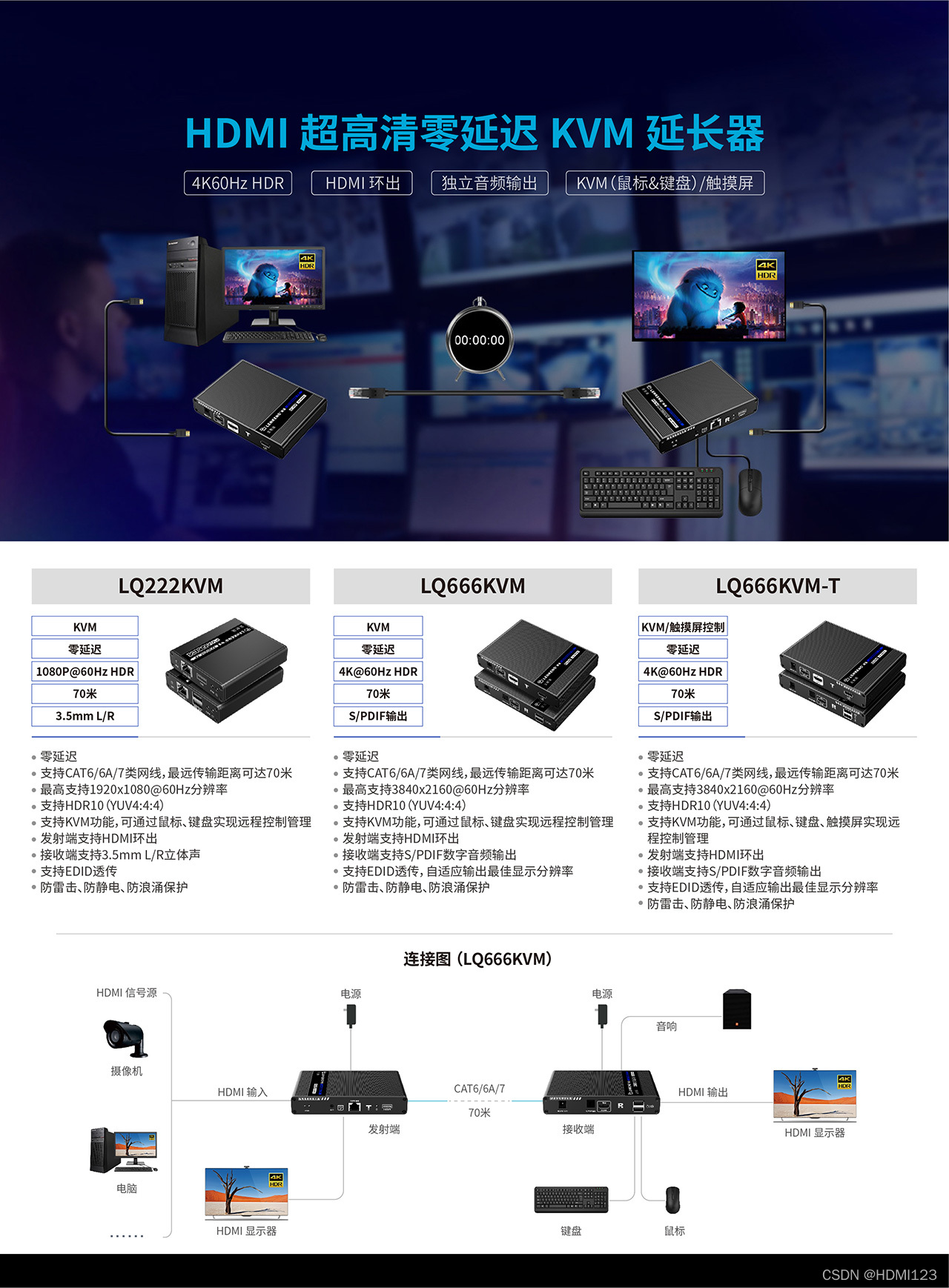 其中HDMI点对点延长器和HDMI KVM点对点延长器不仅支持零延迟,同时在4K@60Hz及1080P@60Hz视频传输上给用户带来全新细腻的视觉体验,防雷击、防浪涌、防静电设计为用户提供了工程应用上的保障。KVM延长器除了支持传统的键鼠远程控制之外,全新推出的LQ666KVM-T延长器支持触摸屏控制,为广大终端用户提供了多样化的选择。