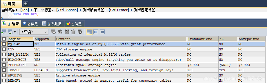 | XA\Savepoints | 当Transaction值Yes,这俩值才有意义,否则均NO,其与事务相关。 |