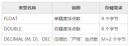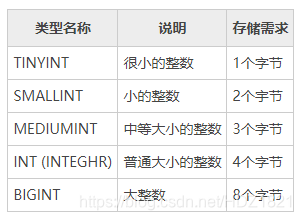 | 数值类型 | TINYINT | SMALLINT | MEDIUMINT | INT | BIGINT | FLOAT | DOUBLE | DECIMAL |