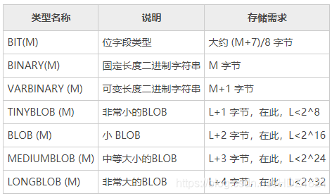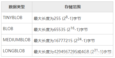 | 二进制类型 | BIT | BINARY | VARBINARY | TINYBLOB | BLOB | MEDIUMBLOB | LONGBLOB |