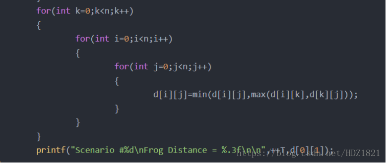 cout << setiosflags(ios::fixed) << setprecision(3) << "Frog Distance = " << m[0][1] << endl << endl;