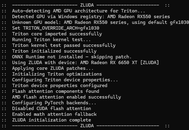 6650xt+ROCM6.2/4+gf1032+python3.11.9+cu11.8+pytorch2.7.1+zluda3.9.4+triton3.0.0