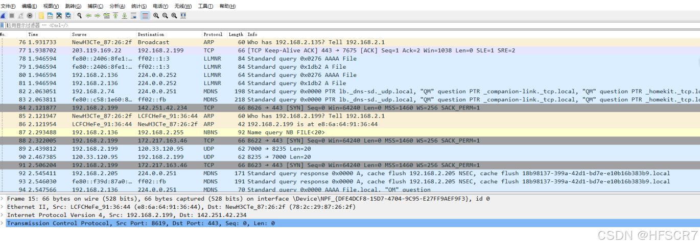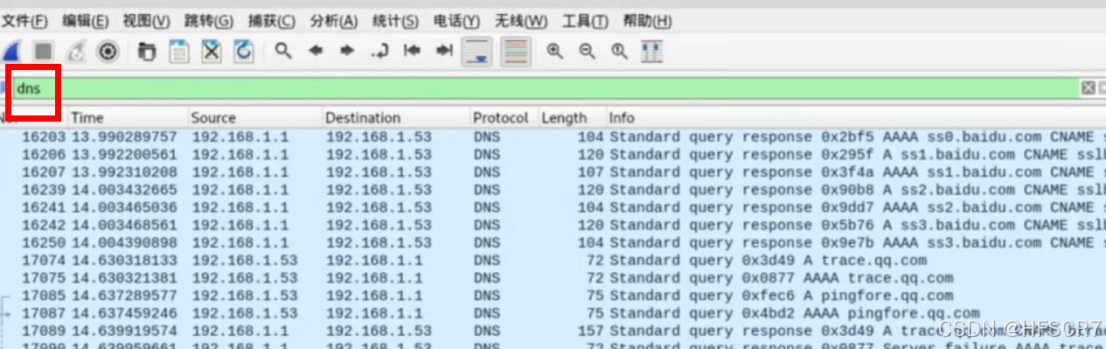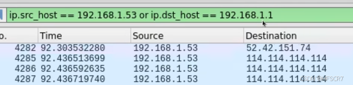 其实我们不仅可以对协议类型进行筛选,我们还有跟多的筛选条件,比如源地址目的地址等等例6:筛选源地址是192.168.1.53或目的地址是192.168.1.1