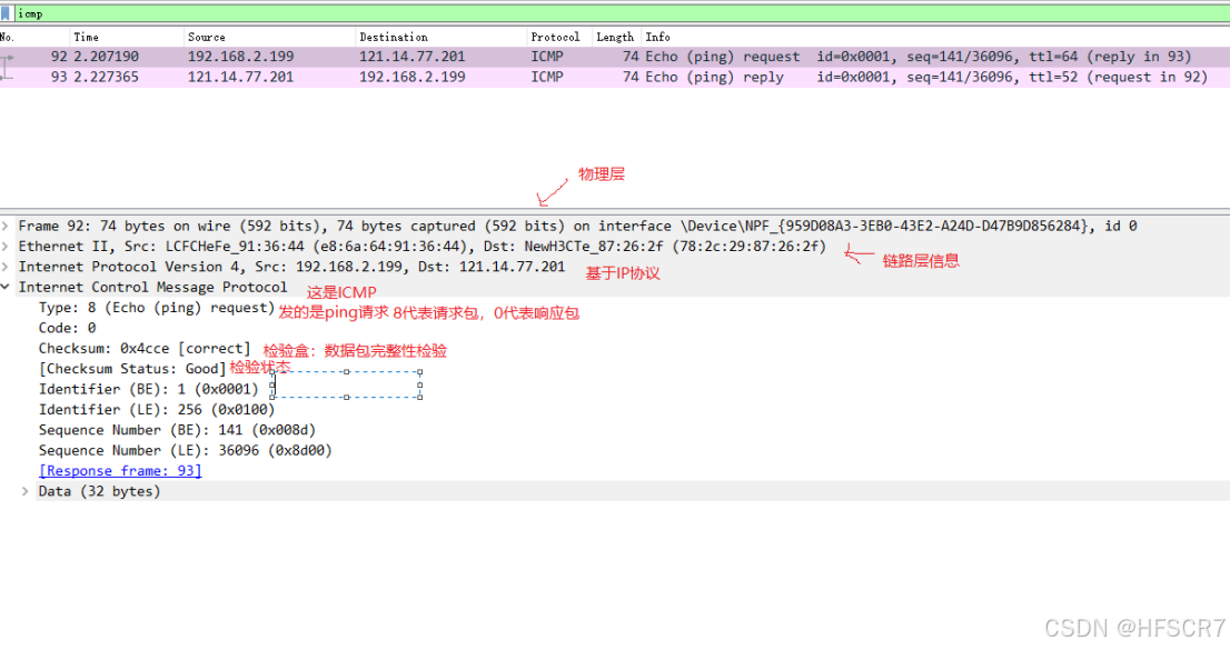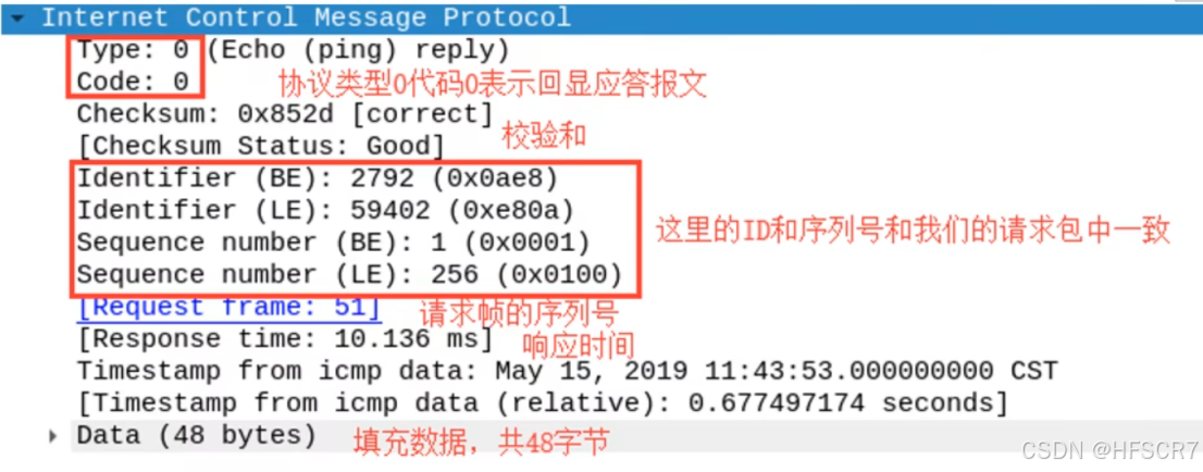接受方返回一个ICMP Echo Reply,包含了接受到数据拷贝和一些其他指令-