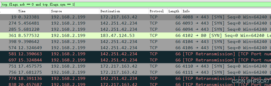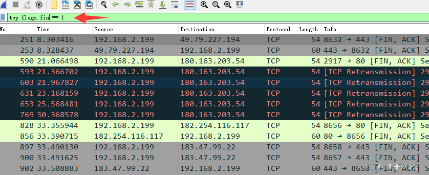 tcp.flags.fin == 1 当 FIN=1 时,表明数据已经发送完毕,要求释放连接