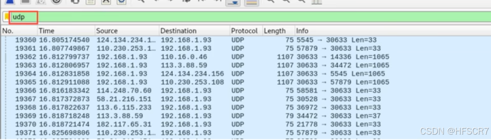 我们使用过滤器输入“udp”以筛选出udp报文。但是为什么输入udp之后出现那么多种协议呢?原因就是oicq以及dns都是基于udp的传输层之上的协议
