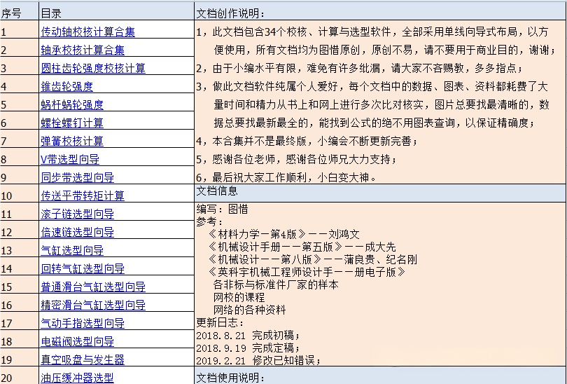 【安装使用方法】绿色版本,点击本文末尾链接下载后,解压即可直接使用,软件为 .xlsx 文件格式,直接打开,按目录索引,目录相当于二级菜单,点击您想要的参数内容,即可获取您想要的设计参数!如下图示所示,文档底部工作表为各个版块类别,相当于一级菜单;无需额外配置。