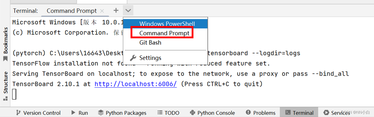 我使用的python环境是conda下的虚拟环境。在该环境下安装完tensorboard后,一定要把Terminal的环境改为Command Prompt(如图),才能使用tensorboard。
