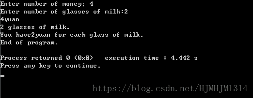 - cout<< money<<"yuan"<< endl<<milk<<" glasses of milk."<< endl<<"You have"<<dpg<<"yuan for each glass of milk."<< endl;