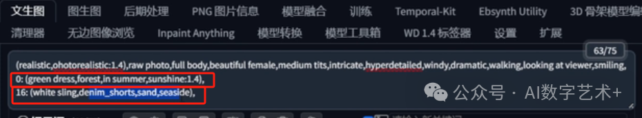 在正向提示词基础上我们描述每一帧的细节,第一帧像我这样一个格式,0冒号,后边一定要空一个格描述一下,框选出来的就是我所要的描述词了,你们可以选择你们要的环境或者场景的描述词,可以适当增加你想要描述词的权重。第16帧再描述一下所穿的服装以及环境,