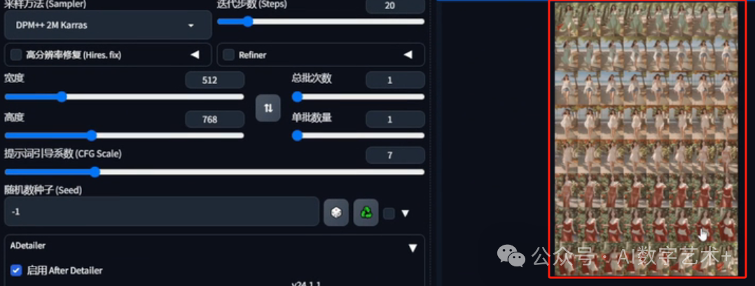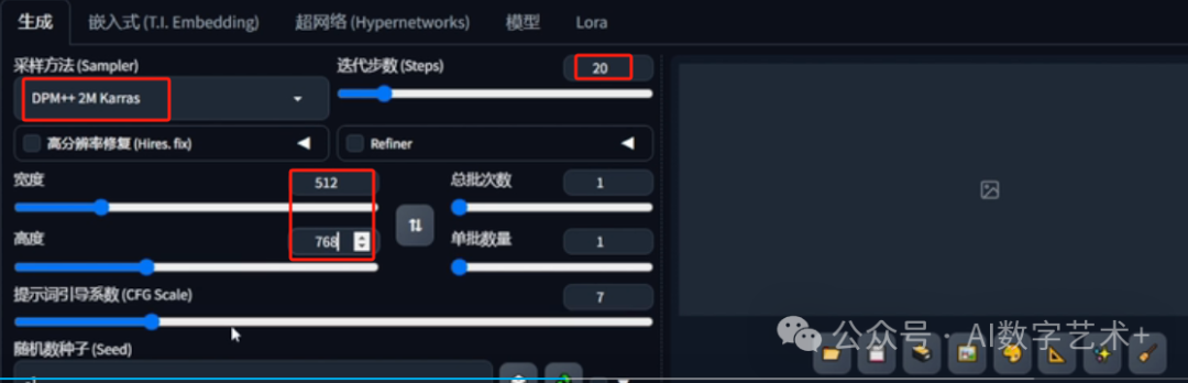 接着再来看一下我们的参数部分,两方法我们选择DPM++2M Karras,迭代步数选择20,宽高的话我们来更改一下,改为512×768。
