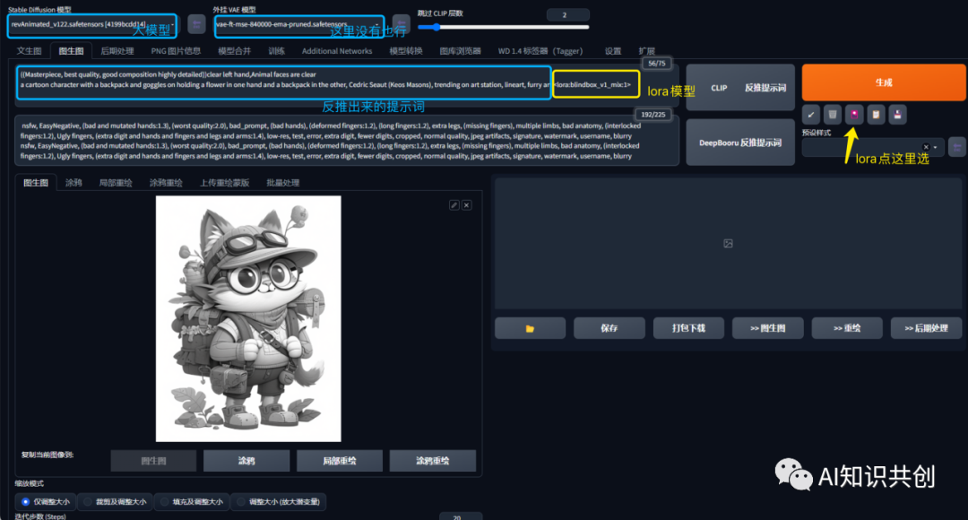 1.打开sd,大模型选用revAnimated_v122.safetensors,Lora模型用blindbox