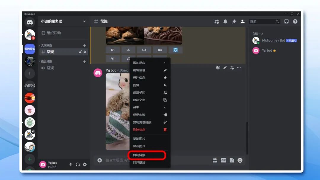 拖入后按回车键,发送给MJ。然后右键我们的图片,选择「复制链接」。