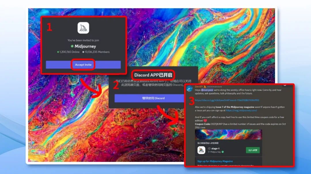 点击后会弹出新的页面,对你发出邀请。接受邀请,看到Discord APP已开启的弹窗后,我们会在Discord客户端内收到邀请信息。此时,MJ就已经被添加到我们的客户端内啦。