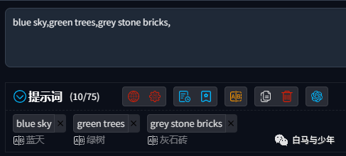 关键词只给了:蓝天、绿树、灰石砖这么简单的几个词。