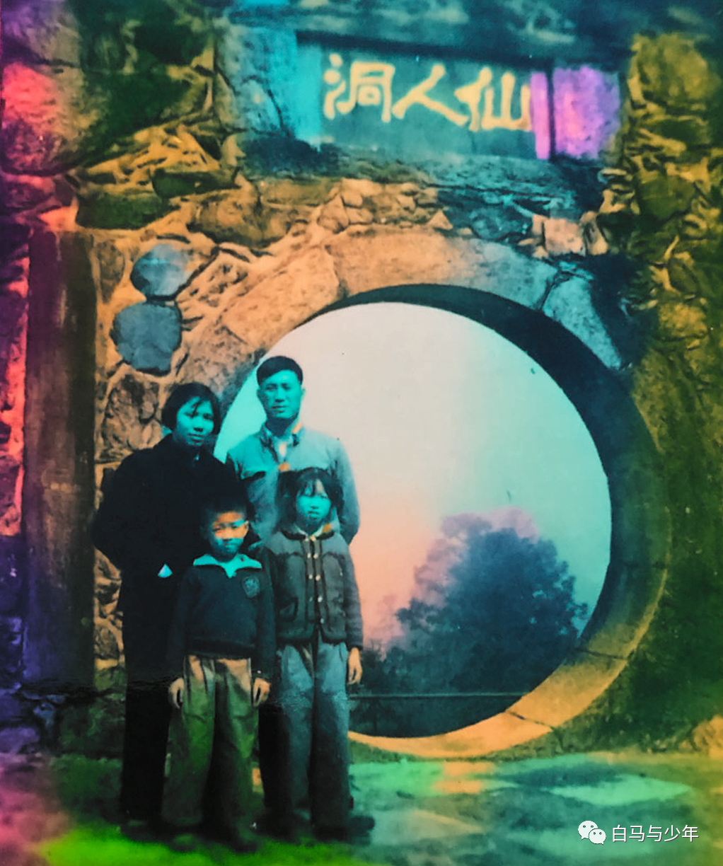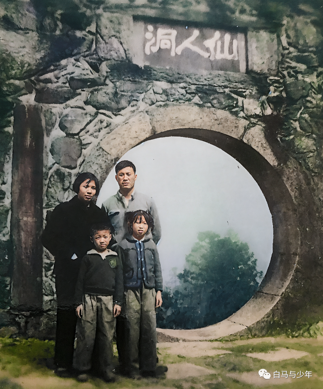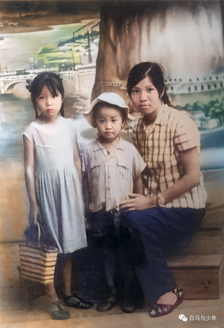 同样难度的还有这张照片,是外婆带着我妈和舅舅拍的合影,应该是在影棚里拍的,背景是张画。这张照片的难点主要还是内容太多了,无法一一指定颜色,所以我只能逐个上色,再用ps进行融合。