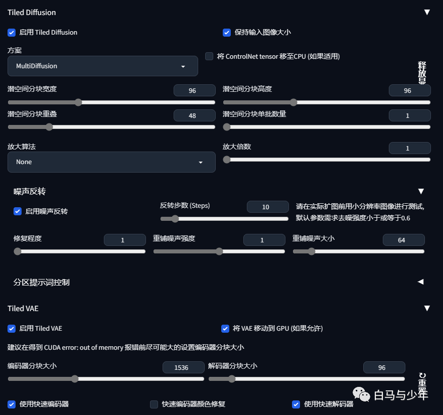 启用MutiDiffusion插件,不开放大倍数,仅使用分块渲染的功能,能帮助我们在显存不够的情况下,将图片放大到足够的倍数。
