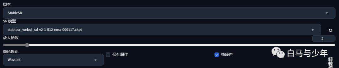所以,接下来我将图片再发送到图生图当中,打开stableSR脚本,放大两倍。这个放大插件是所有插件中对原图还原最精准的,也是重绘效果最好的。