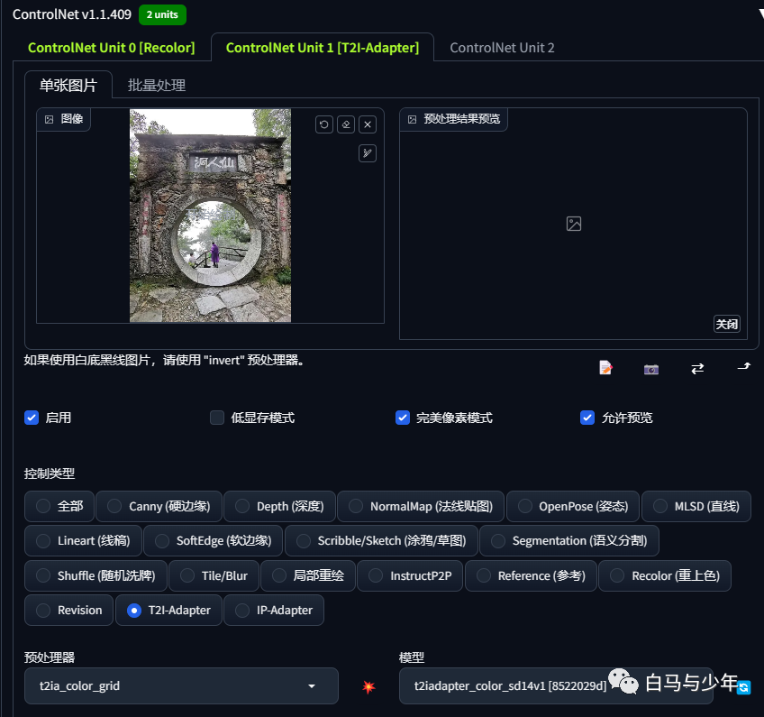 ControlNet这里选择Recolor,预处理器有两个,经过我的测试,选择“recolor_luminance”的效果会更好一些。