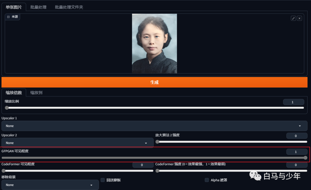 将照片放入到后期处理中,使用GFPGAN算法将人脸变清晰。