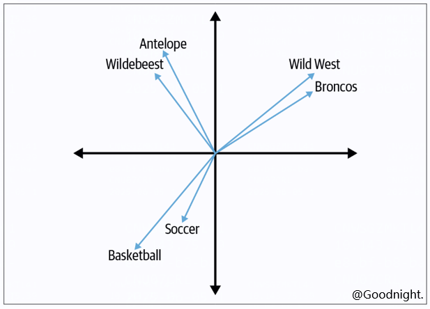 以上图为例,比如 “Antelope” 和 “wildebeest” 的向量中,角马和羚羊都属于动物,他们的向量关系比较接近;