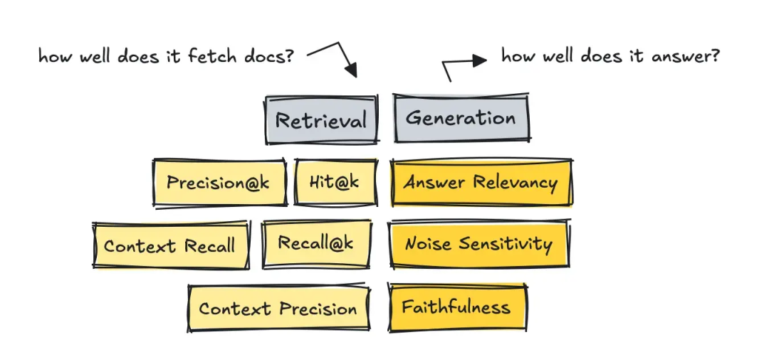 针对 RAG 系统,我们需要将评估流程拆分为两部分:分别衡量检索环节与生成环节的质量。