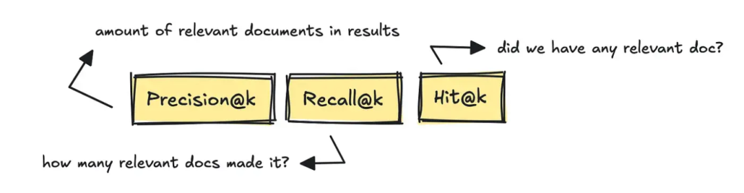 这三个指标分别从不同角度衡量检索系统的表现:实际检索到的前 k 个文档中,有多少个是真正相关的、所有应该被检索到的相关文档(在标准答案里的)中,有多少个出现在了你检索到的前 k 个结果里、在前 k 个结果里有没有“命中”至少一个相关文档。