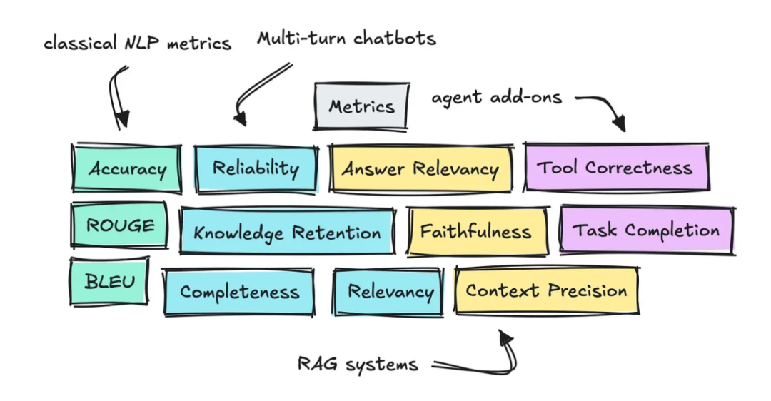 需要特别说明:尽管现有框架已有不少定义好的评估指标,但你的实际使用场景可能会有所不同。了解通用评估指标是有价值的,但切勿直接假定它们完全适用于你的应用场景。