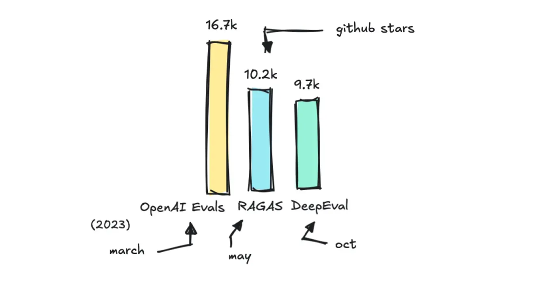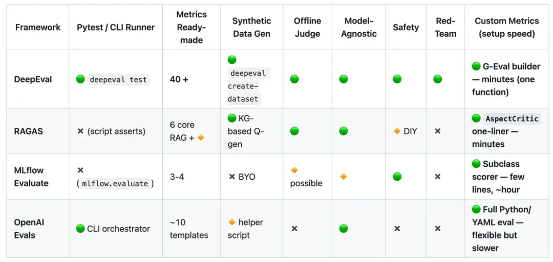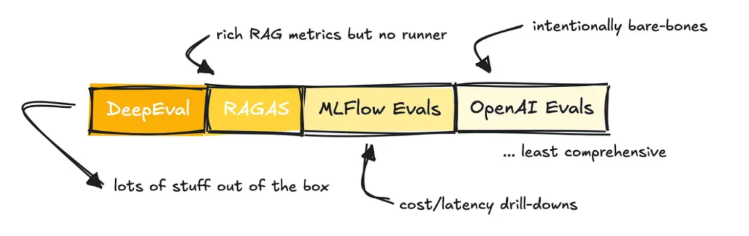 OpenAI 的 Evals 和 MLFlow 的 Evals 更像是附加组件而非独立框架,而 RAGAS 最初是专为 RAG 应用设计的指标库(尽管后续也扩展了其他指标)。