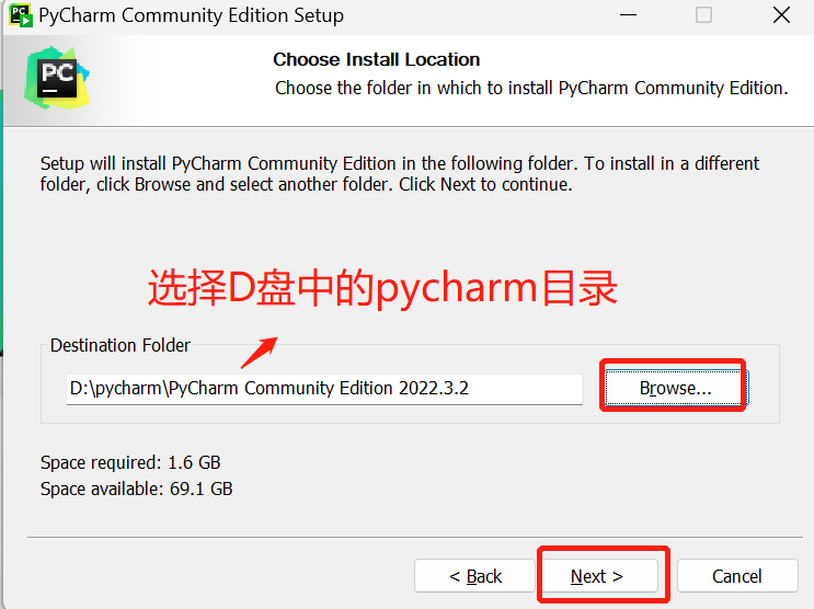 2、下载完后,将exe文件放置D:\pycharm,然后双击打开exe按以下步骤即可安装