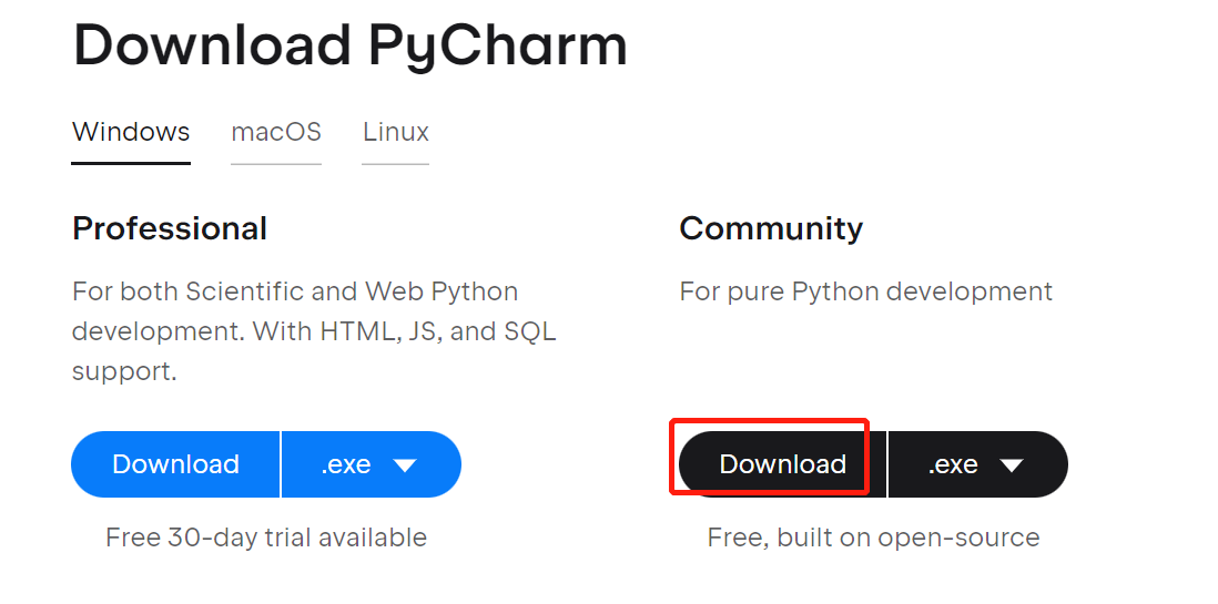 1、同样,这里展示的是windows系统的Pycharm安装流程,在Python官网Pycharm官网找到你想安装的版本,下载社区版本(日常学习使用够用了),专业版是收费的哦(功能更强大)。