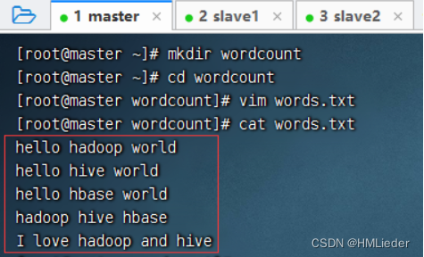 在虚拟机上创建文本文件,创建wordcount目录,在里面创建words.txt文件。