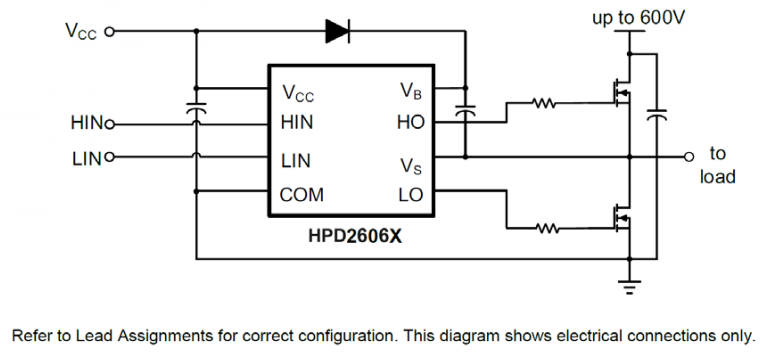 例如,HPD2606X就是华普微近期推出的一款高压、高速功率MOSFET和IGBT驱动器。该器件采用了专有的HVIC(高压集成电路)技术及抗闩锁CMOS工艺,具有稳定的电路结构。其逻辑输入兼容标准CMOS或LSTTL电平信号,最低可支持3.3V逻辑电压。输出驱动级配置了高脉冲电流缓冲器,可有效抑制驱动信号间的交叉导通。此外,通过浮置通道设计,该器件可支持最高600V工作电压的高边配置,用于驱动N沟道功率MOSFET或IGBT器件。