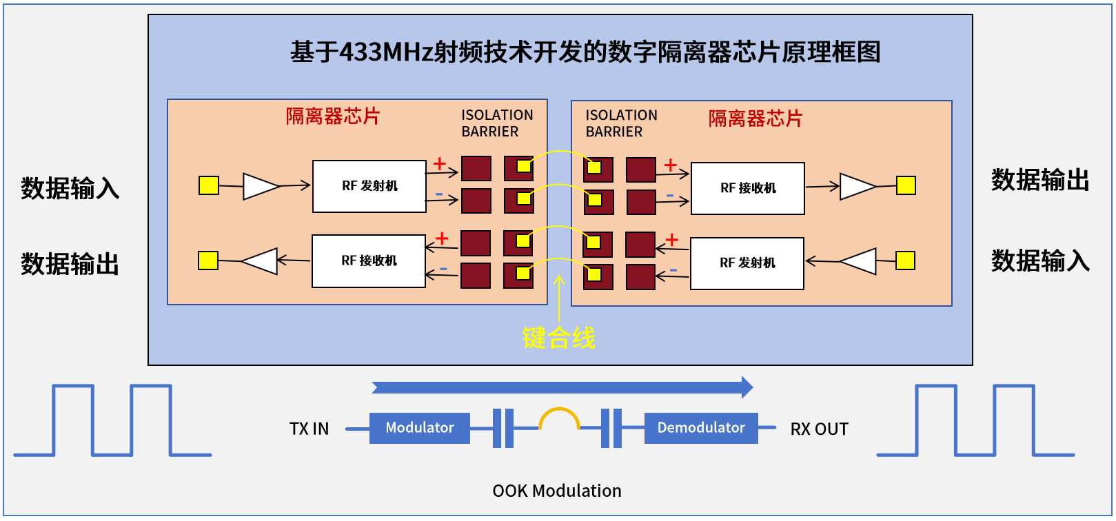 例如,华普微基于433MHz射频技术自主开发的数字隔离器就可有效提升终端设备的运行稳定性,其工作原理为通过OOK调制技术将MCU输入的数字信号调制为高频脉冲信号(具备交流特性),而后通过电容电场耦合传输至信号接收端,信号接收端再将其解调输出为原来的数字信号,从而实现高低压电路的电气隔离。
