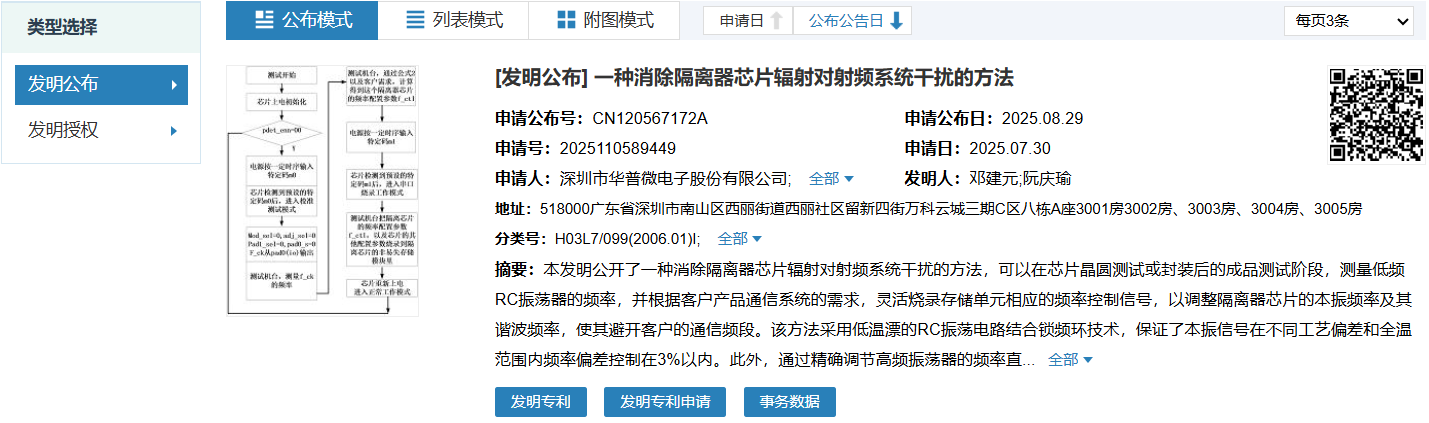 2025年9月26日,数字隔离器芯片源头厂商——深圳市华普微电子股份有限公司自主研发的发明专利《一种消除隔离器芯片辐射对射频系统干扰的方法》已正式获得国家知识产权局授予的专利权,授权公告号为CN120567172B。