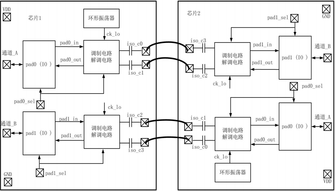 而要传输的数字信号则会从芯片1的PAD输入至调制电路中,并通过OOK调制到载波信号中,随后通过电容电场耦合传输至芯片2的解调电路中。