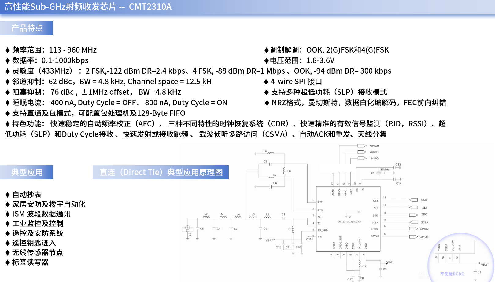 CMT2310A是一款拥有多种特色收发功能、可有效提升物联网设备无线通信质量的数字模拟一体化收发机产品,其使用32MHz晶体提供PLL的参考频率和数字时钟,支持Direct和Packet两种数据处理模式,并具备高达+20dBm的发射功率和-122dBm的灵敏度,可极大地优化智能四表无线集抄的链路性能。