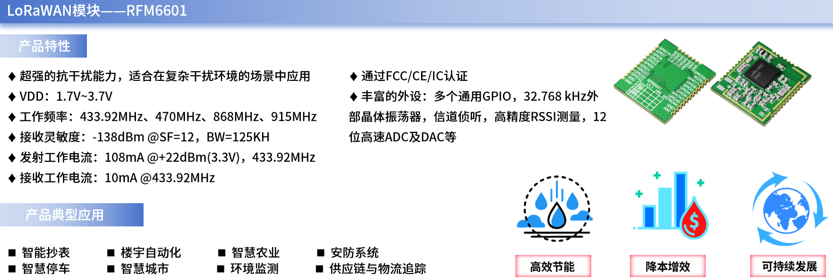 RFM6601是一款通过FCC/CE/IC认证的,具备低功耗、高灵敏度、远距离通信与高性价比等优势的LoRaWAN模块,其内部将通用MCU、射频收发器、调制解调器及其外围器件高度集成,支持LoRaWAN节点,可高效构建智能四表无线集抄网络,在低信噪比环境中仍能稳定、准确地传输数字信号,并大幅延长智能四表的电池寿命。